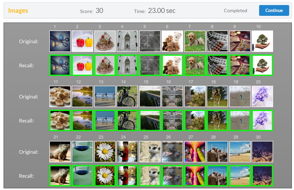 Select “Level Explanations” at the upper-right hand corner and read how to reach the next level. There are 10 levels in the Images Discipline. As a beginner, you start at level 1 with 6 random images to memorize in 60 seconds, but your goal is to ultimately reach level 10 and to memorize 30 images in 60 seconds or less. I will provide a recommended training schedule at the end of this post so you may reasonably accomplish this goal.