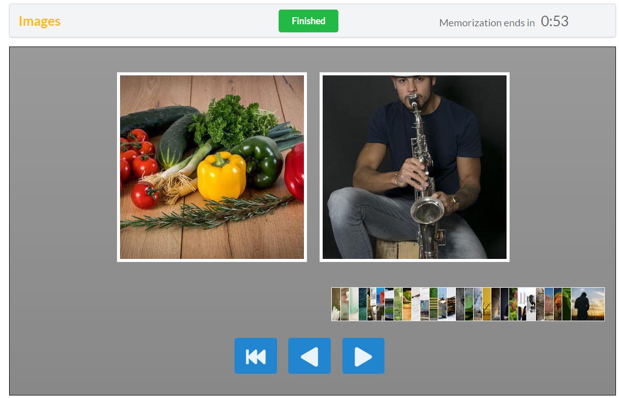 After the recall preparation time is complete, you will be directed to the recall page. Here you will find empty boxes that need to be filled with images and a set of shuffled images at the bottom. Boxes 1 and 2 are for images 1 and 2 that you memorized at locus 1, boxes 3 and 4 are for images 2 and 4 that you memorized at locus 2, and so on. Select a box that you would like to insert an image, and then click on the correct image at the bottom in order to place it in the yellow box. You will have 4 minutes to put all the images in order.