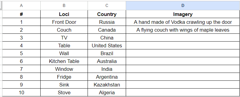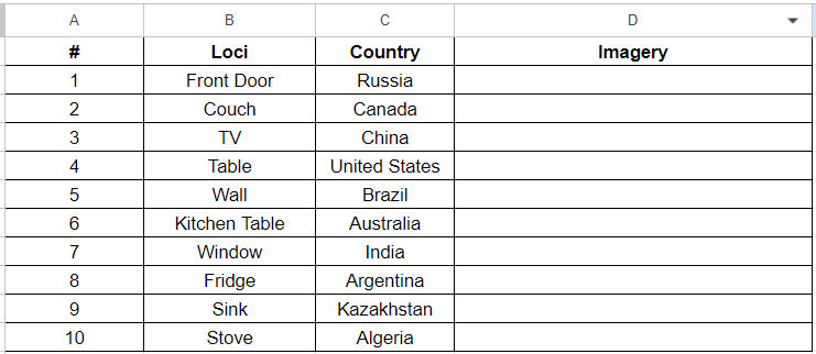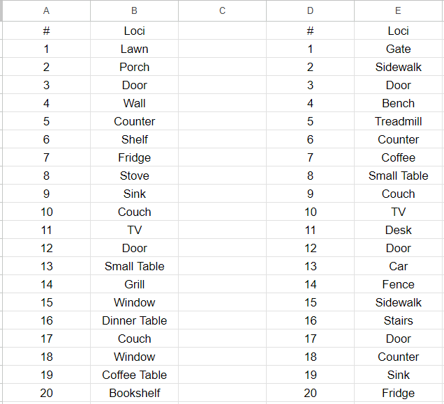 If you are using a spreadsheet, it should look similar to the image below, however, since we are not using the same memory palace, the type of loci and their order may be differ from what is listed. Before we proceed, it is vitally important that you use a place that you are personally familiar with as a memory palace. Do not use mine.